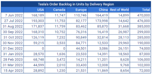 毕竟,从特斯拉产销数据分析师Troy Teslike的统计来看,虽然截至2月底,大打特打“价格战”令特斯拉位于全球手握的订单量回暖至10.6万辆,但截至4月15日,特斯拉订单储备再次回落至7.2万辆,已经是历史最低值。