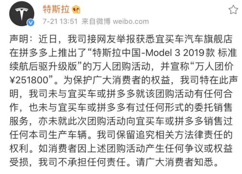 今年7月,拼多多平台宜买车汽车旗舰店推出了2019款特斯拉Model 3万人团购活动,并宣称“万人团价¥251800”。但特斯拉并不吃这一套,其以“干扰特斯拉定价权,扰乱直营卖车模式”为由拒绝向车主交付车辆。