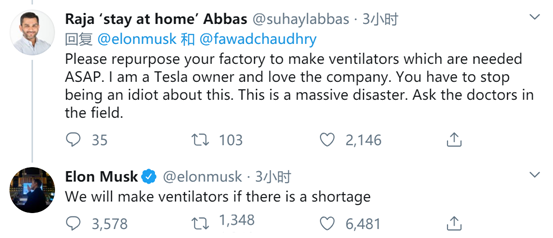 一位名叫Raja ‘stay at home’ Abbas的用户在Twitter上对马斯克表示:“请让你的工厂尽快开始生产当前急需的呼吸机。我是一名特斯拉车主,我也热爱这家公司。对于这件事,你不能再犯傻了。这是一次巨大的灾难。你可以咨询相关领域的医生。” 随后马斯克回复这名用户称:“如果有短缺的话,我们将会生产呼吸机。”