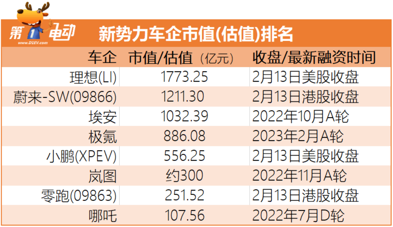 2月13日,极氪宣布完成7.5亿美元(约合人民币51亿元)A轮融资,投后估值130亿美元(约合人民币886.08亿元),逼近埃安1032.39亿元的估值,高于小鹏2月13日美股收盘的市值,位居新势力车企市值(估值)第四。