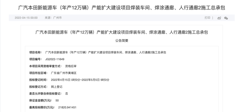 其实该项目已经在3月底批前公示结束,3月17日,广汽本田新能源车(年产12万辆)产能扩大建设项目批前公示。5月初消息显示,冲压车间施工总承包的招标评标工作已经结束。