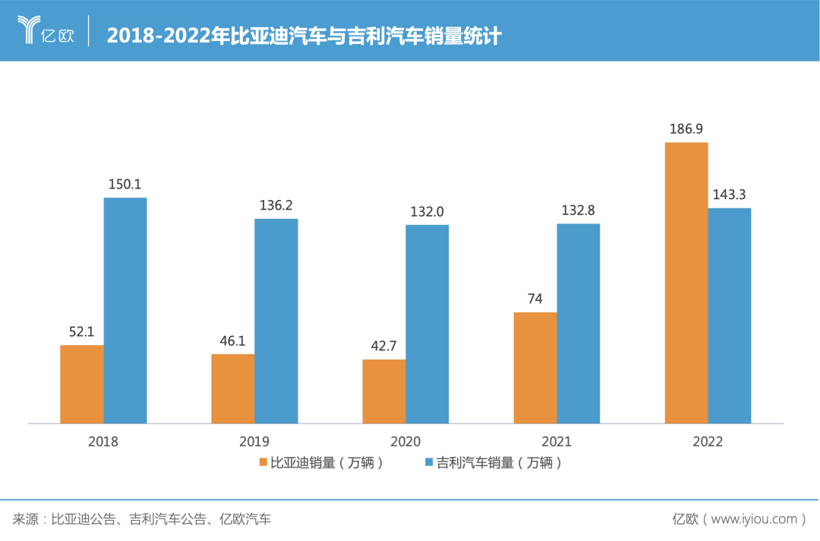 仅2022一年时间,突然被比亚迪赶超,吉利确实有点懵了:同朝造车,为什么比亚迪一年销量同比增长208.64%,大增113.35万辆?为什么2021年还少自己近60万销量的比亚迪,用了一年时间就比销量上涨的自己还多卖了43万辆车?