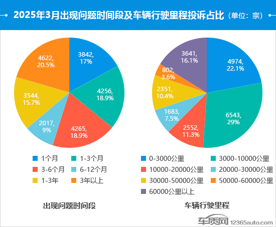 3月,行驶里程在10000公里以内的投诉量和投诉占比出现“跳水”,占比较2月份降低了17.7个百分点。与2月份有所不同的是,本月行驶里程60000公里以上的投诉占比升至两位数,环比增加8.4个百分点。