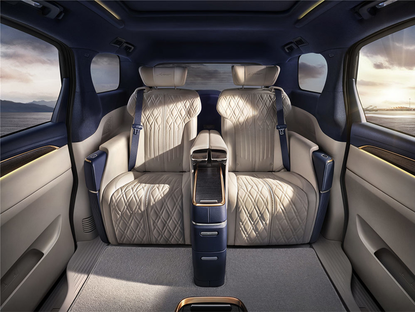 此外,两个座椅间还留有170mm的宽绰中间通道,方便第三排乘客进出。第三排同样配备两个独立贵宾座椅,座椅可前后调节160mm,椅背倾斜角度调节最大146度,接近半躺姿态;带6档可调独立扶手和加热/通风功能,还原第二排尊贵体验。值得一提的是,全车座椅包覆都甄选进口全粒面上等牛皮,经38道制皮工艺成型,并饰以精细的菱格纹理,结合人体工程学开发和专利技术,不仅华贵气质油然而生,在乘坐舒适性上也实现了自我超越。此外,车内还为第二排宾客准备了豪华翻折小桌板、后排230V电源,并为每位乘员都配备了USB充电接口,贴心满足高端商务与休闲需求。