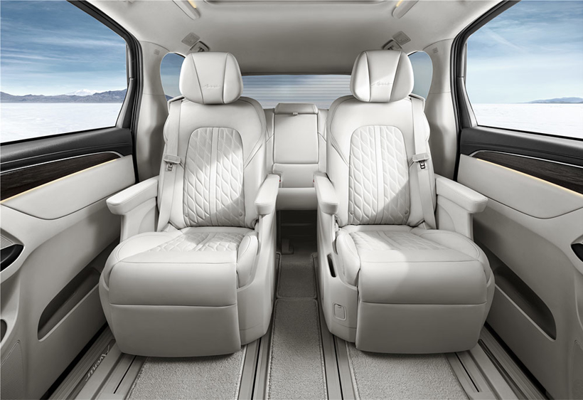 六座车型以行政级礼遇让车内第二、第三排每位乘员都能获得豪华、独立、舒适和体面的出行体验。第二排座椅采用全包覆式设计,侧围在木纹与金属装饰的烘托下突出雕塑美感;扶手宽度增加近30%,让坐姿更舒适。座椅增加了前后滑动电动解锁功能,并提供电动调节椅背、腰托、腿托以及加热、通风、按摩功能,配备侧翼六向可调航空头枕、手机放置槽、弹出式双杯托和USB充电口,为乘员带来媲美头等舱的尊享体验。