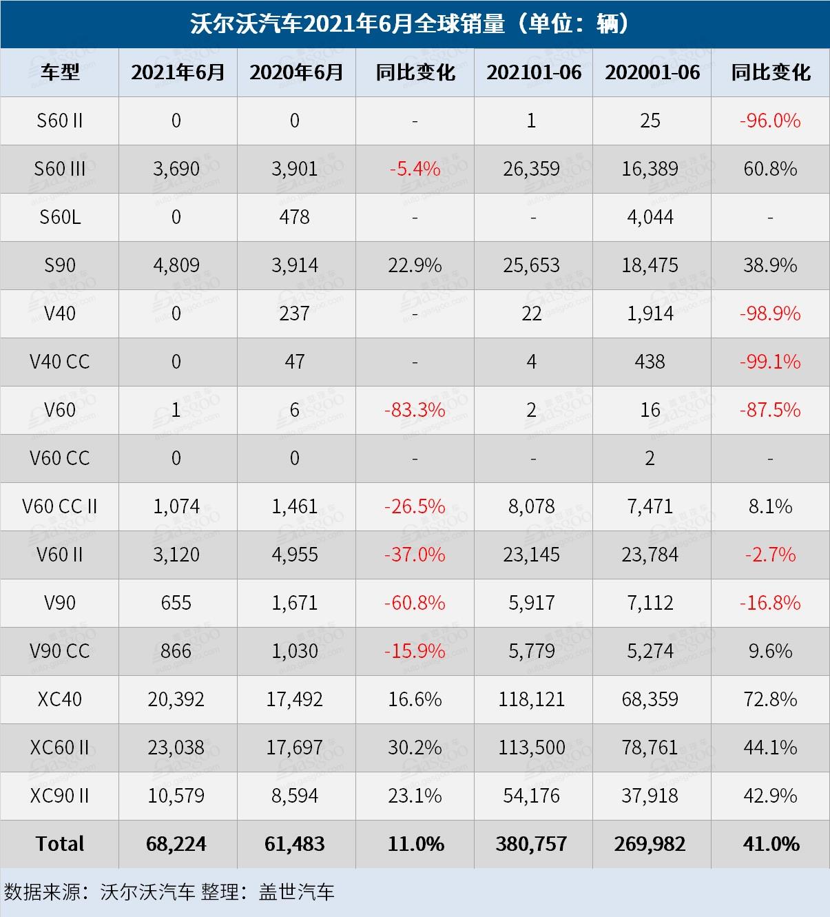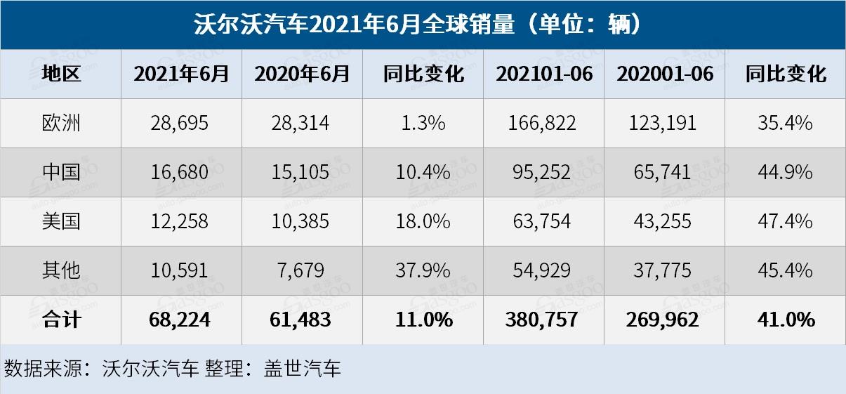 车界地球讯 根据沃尔沃汽车公布的销量数据,该公司6月在全球范围内共售出68,224辆新车,同比涨幅为11%。今年上半年,沃尔沃汽车全球销量为380,757辆,较去年同期上涨41%。更重要的是,沃尔沃汽车今年上半年的销量打破了2019年同期创下的销量纪录(340,826辆),实现新高。