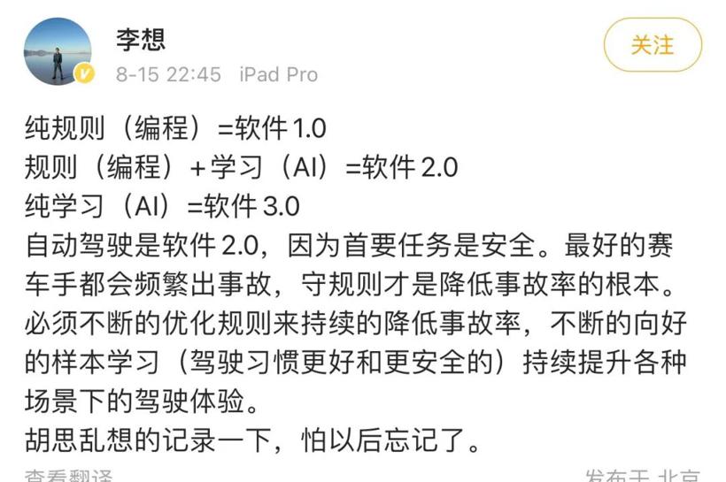 不知道是不是受到林志颖事故的影响,李想在前不久在微博上发表了自己对于近日这一系列事故的感慨:“纯规则(编程)=软件1.0;规则(编程)+学习(AI)=软件2.0;纯学习(AI)=软件3.0。而自动驾驶是软件2.0,因为首要任务是安全,最好的赛车手都会频繁出事故,守规则才是降低事故率的根本。”