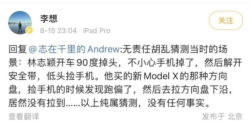 同时,李想也猜测了林志颖发生车祸的经过,当然,李想也强调是自己无责任胡乱猜测当时的场景:“林志颖开车90度掉头,不小心手机掉了,然后解开安全带,低头捡手机。他买的新Model X的那种方向盘,捡手机的时候发现跑偏了,然后去拉方向盘下沿,居然没有拉到……以上纯属猜测,没有任何事实。”