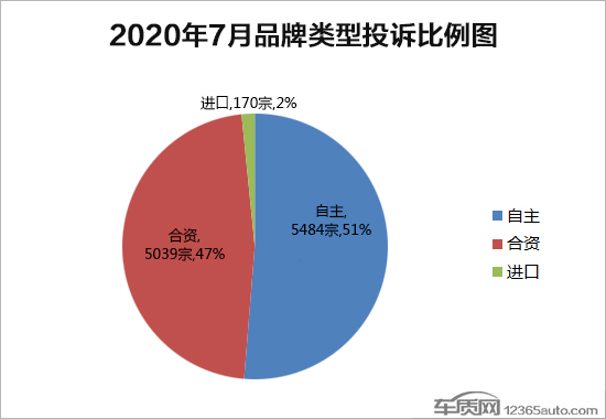 7月,自主品牌、进口品牌的投诉量双双突破5000宗,其中自主品牌投诉量环比上涨46.2%,创造了近十年来月投诉量历史最高记录,投诉占比时隔两年再次超越合资品牌。