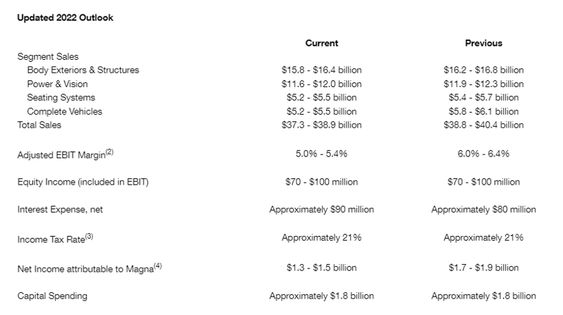 由于全球预期产量下降,麦格纳下调了今年的业绩预期。麦格纳预计全年的销售额约为373亿至389亿美元,此前的预期介于388亿至404亿美元;净利润约为13亿至15亿美元,低于此前预期的17亿至19亿美元;调整后的息税前利润率介于5%至5.4%,此前为6%至6.4%。