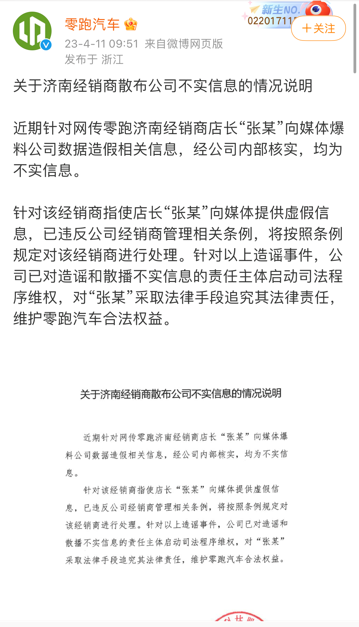 对此,零跑汽车于4月11日发布了《关于济南经销商散布公司不实信息的情况说明》。